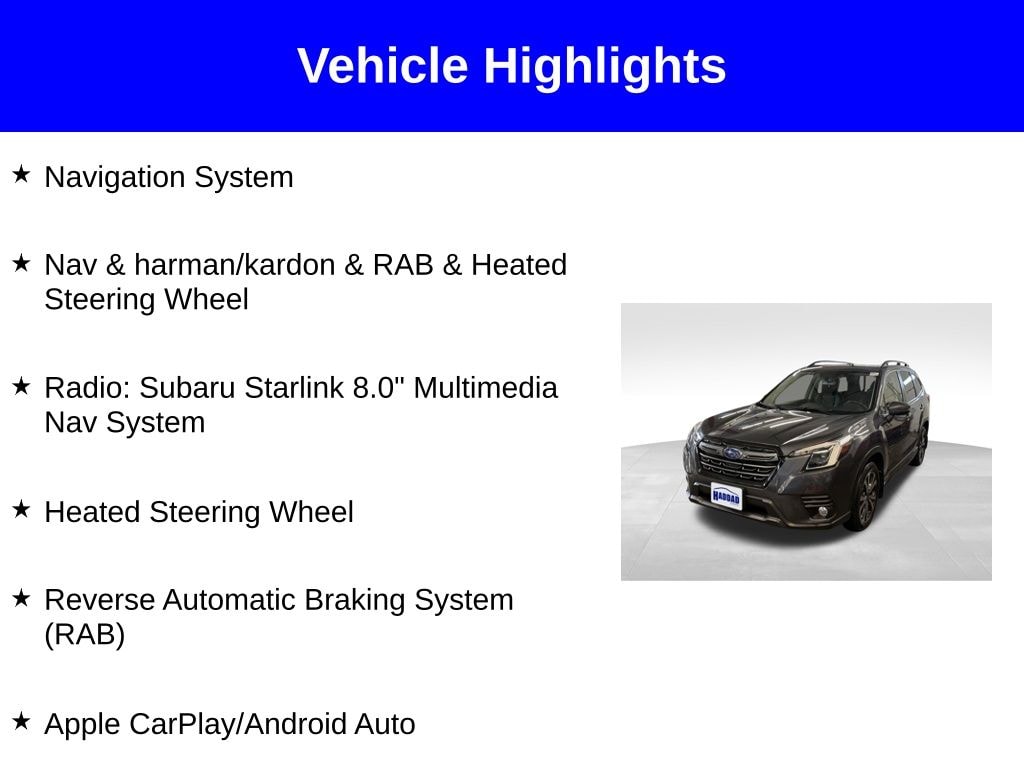 Forester Limited, Magnetite Gray Metallic, Apple CarPlay/Android Auto, Heated Steering Wheel, Nav & harman/kardon & RAB & Heated Steering Wheel, Navigation System, Radio: Subaru Starlink 8.0" Multimedia Nav System, Reverse Automatic Braking System (RAB).