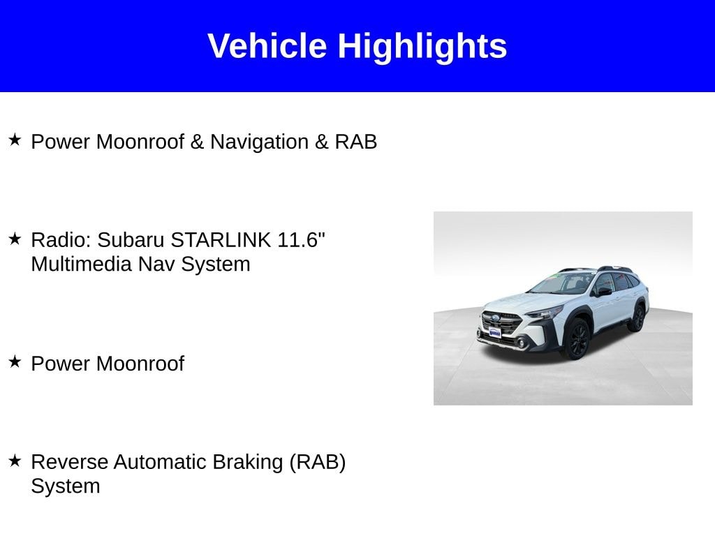 Power Moonroof, Power Moonroof & Navigation & RAB, Radio: Subaru STARLINK 11.6" Multimedia Nav System, Reverse Automatic Braking (RAB) System.